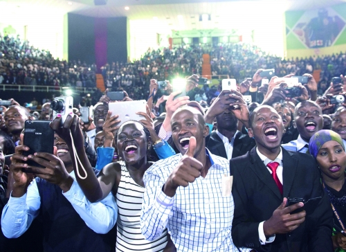 7月25日早晨,到访的美国总统奥巴马首次在肯尼亚公众面前亮相,就立刻被会场中自发起立的观众们热烈的欢呼、掌声和手机拍照的声音包围了。观众席中有他的继祖母莎拉和同父异母的妹妹奥玛。