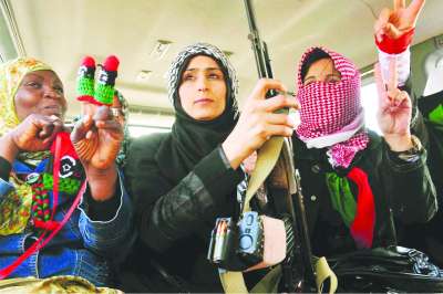 4月1日,在利比亚艾季达比耶镇,支持反对派的利比亚妇女手持AK-47自动步枪准备与政府军作战。