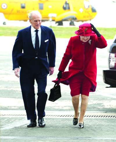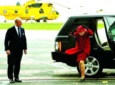 2011年4月1日,英国女王伊丽莎白二世当天来到位于威尔士西南的安格尔西岛,看望在皇家空军基地服役的孙子威廉,途中不时以手护住帽子,以防被风吹跑。