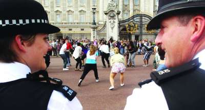 2011年5月9日,英国东伦敦大学的学生在白金汉宫外举行“皇家快闪舞蹈”活动,引得路人聚集围观。而面对这种貌似属于“非法聚集”性质的活动,两名白金汉宫大门外的警察相视而笑。