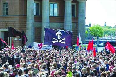 2009年初,“海盗湾”终于被推上被告席,瑞典首都斯德哥尔摩的一家法院以侵犯版权罪判处“海盗湾”4名创始人各一年监禁,并处以总额为360万美元的罚款。然而,因“海盗湾”蒙受数十亿美元损失的娱乐和唱片公司还没来得及庆祝,耳边就传来了盗版支持者一浪高过一浪的抗议声。法庭做出对“海盗湾”创始人有罪的判决后,上千人走上斯德哥尔摩街头示威。抗议人群头缠围巾,高举海盗旗,以示对“海盗湾”的支持。除斯德哥尔摩以外,哥德堡等其他瑞典城市也相继发生了抗议事件。而这些抗议活动的幕后组织者,是瑞典的盗版党。