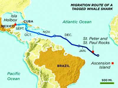 人们无法理解鲸鲨为何要潜入如此深的海底(鲨鱼不像其他鱼类那样拥有控制身体漂浮的鱼鳔)。一种观点认为,鲸鲨以自由落体方式下潜是为了休息。2007年,罗伯特·休特在一头25英尺长、被他昵称为“里奥夫人”的怀孕雌鲨身上安装了卫星标签。在随后的150天时间里,“里奥夫人”游动了近5000英里(约合8046公里)——穿过加勒比海,前往巴西以东,最后到达阿森松岛北部和圣彼得-圣保罗礁(位于巴西和非洲中间)南部。没有人知道鲸鲨在哪里生儿育女,休特认为,圣彼得-圣保罗礁海域可能就是它们的繁殖地之一。