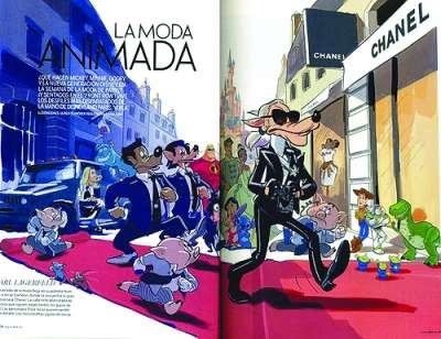 在“La Moda Animada”专题里,卡尔·拉格菲尔德被设计成“高飞狗”的造型,沿着红地毯走到香奈儿的店里去;一向以冷艳造型示人的多纳泰拉·范思哲变身为一只性感的鸭子,在镜头面前接受采访;Dolce & Gabanna品牌的两位设计师分别被设计成卡通狗和卡通老鼠,共同伏案研究设计草图。