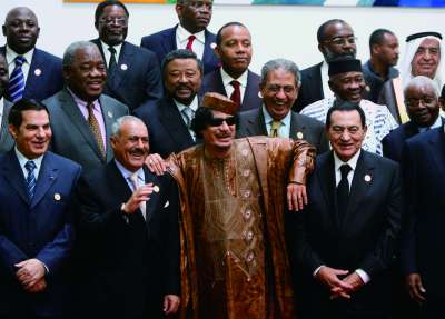 2010年10月9日,阿拉伯国家联盟特别首脑会议在利比亚开幕,会议主席卡扎菲(前排右二)与埃及前总统穆巴拉克(前排右一)、也门总统萨利赫(前排左二)以及突尼斯前总理本·阿里(前排左一)合影。(资料图片)图片来源 CFP