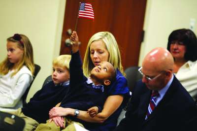 出生在中国的6岁男孩扎克利·希尔兹接过自己的国籍证明和小国旗。 |