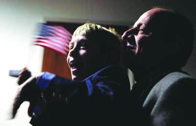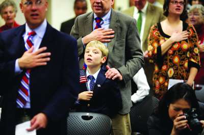 9岁男孩约翰·马修与身后的养父一起说效忠誓词。他出生在俄罗斯。 |