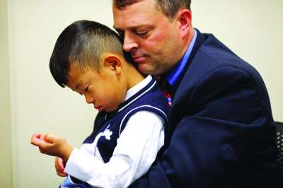 出生于中国的4岁男孩诺亚被阿莱克斯·艾富里紧紧抱在怀里,他们在等待一场公民入籍仪式。仪式过后,阿莱克斯和诺亚就是一对合法养父子了。