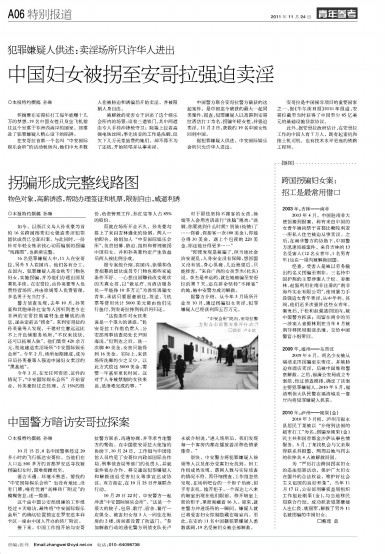 中国警方联合安哥拉警方破获的这起案件,是中国迄今破获的最大一起同类案件。据查,犯罪嫌疑人以高薪到安哥拉酒店打工为名,拐骗年轻女性,并强迫卖淫。11月2日,获救的19名中国女性回到中国。