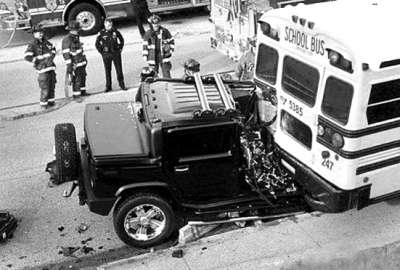 这张照片记录的是发生于2006年11月美国印第安纳州首府印第安纳波利斯市的一起事故。一辆悍马越野车车撞上了停在路边的空校车。原本以坚如装甲著称的悍马这次却不堪一击,整个车体前部几乎被完全撞碎,而那辆校车却没受什么损坏,美国校车由此一撞成名,其安全性令人赞叹。有报道称,美国的校车是客车的设施、卡车的骨架,安全性达到了普通车辆的40倍。