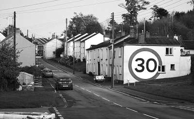 据英国《每日邮报》报道,英国德文郡的一个小村庄最近出现了一个极度醒目的限速标志,它被喷涂在一座房子的外墙上,块头差不多有一辆双层客车那么大,直径竟达9米。