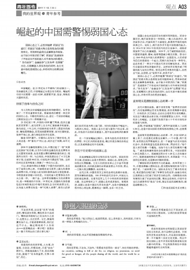 在高速崛起过程中出现的自负与自卑,原因有很多方面,但弱国心态是主要原因。弱国心态,很难言明,但经过长期酝酿,它在人们的言谈举止之中会不经意地流露出来,而其最直接的后果就是要么不自信,要么一旦强大便会飘飘然,妄自尊大。