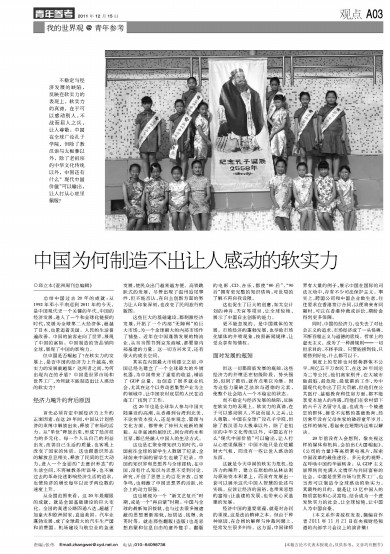 但中国是否崛起了?在软实力的发展上,是否中国的经济力上升越高,软实力的发展就越低?这两者之间,为何出现内在的矛盾?中国是世界市场和世界工厂,为何就不能制造出让人感动的软实力?