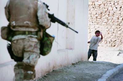 2005年8月24日,一个小男孩向巡逻的美军士兵挥了挥手。 |