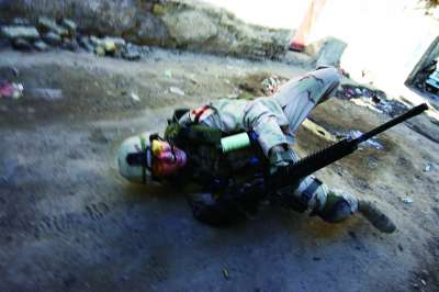 2005年2月16日,美军士兵霍金斯在巴格达的一场交火中中弹倒地的瞬间。 |