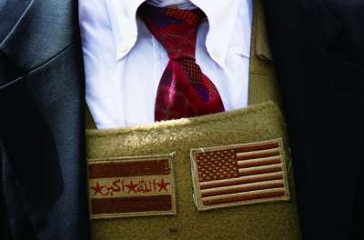 美国时任驻伊大使克罗克的防弹衣上,并排缝着伊拉克国旗和美国国旗(摄于2007年9月6日)。 |