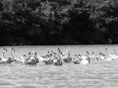 最初的兴奋过后,我们折回塞莱斯通镇上,在海湾登上一艘小船。这次,虽然没能再看到经常藏在军舰鸟影子下面的海豚,我们却在浅滩处巧遇了谁都不愿错过的超级明星——火烈鸟,它们为数众多,粉红色的身躯与细细的长腿异常醒目。欣赏完这些尤物,我们在一个木制码头上靠岸。“常绿阔叶林,”亚历克斯说,“这很特别,别出声,慢慢跟我来。”