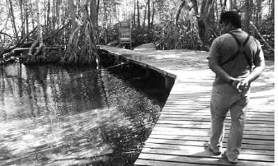 大伙儿顺着木板路走进两排大树搭成的巷道。脚边水潭里的大海鲢晒着太阳,裸喉虎鹭在几米外一动不动地肃立着,只手可及的枯枝上则栖息着一只美洲粉颊小翠鸟,它的眼睛在阳光下一闪一闪,与我对视了好久才飞走。突然间,我感到一团黑影掠过上空,抬头望去,总算来得及分辨出那是一只肚皮呈灰白色的鹗。“我们这儿85%的鹗都是候鸟,”亚历克斯仍是一副生物学家的派头,“我能看出那是位女士——这里60%的鹗是雌性。”