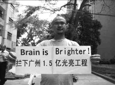 广州市建委在今年6月宣布投入1.5亿元来升级夜景灯光,并公开进行工程招标。这项决议引发民意的强烈反弹,自6月末开始,广州先后有两名年轻人通过网络征集光头与大拇指的照片,以此呼吁广州市建委暂缓工程,公开光亮工程的可行性研究报告。他们的呼吁获得市民的积极响应,两人被亲切称为“光头哥”与“拇指妹”。