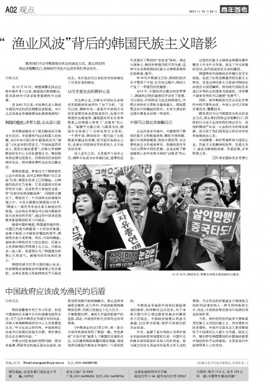 从这次渔业争端中,中国看到了韩国民族主义的极端表现:撕扯中国国旗、敲打中国渔船模型、围攻大使馆等。在这番民族主义的表演背后,则涌动着自卑与自大两种不同的思潮。这也反映了韩国国民心态中有抹不掉的“边缘者”的心态。