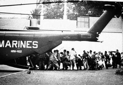 次日凌晨3点30分,又一封急电从白宫飞来。福特总统的指示很简单:马丁大使立即撤离,剩下的人当中只撤美国公民。上校飞行员格里·贝里驾机飞往大使馆,一着陆就向基恩口述了命令。目送大使平安升空后,基恩跑向院子里维持秩序的海军陆战队警卫:“听我命令,大家组成半圆形队形悄悄撤到大使馆屋顶,不要跑,也别大声吆喝。”
