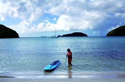 和男友约翰初至维京群岛,我对SUP——stand-up paddle boarding(立式单桨冲浪)知之甚少。但我很快发现,没有什么比站在立式冲浪板上观海更棒的体验了:无论坐在船上还是潜水,总存在这样那样的盲区。站在冲浪板上却可以拥有无障碍的360度视觉体验。你可以极目远眺海岛风光,也可以俯首观望群鱼嬉戏,但凭心意。