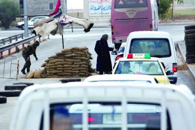 进入大马士革的公路上,检查站用沙袋垒起了工事。 |