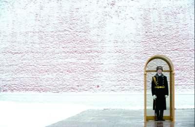 来到克里姆林宫北侧,穿过挂着冰霜的大门,前方就是庄严肃穆的无名烈士墓。鹰一样的警卫站在玻璃亭子里,盯着过往的每一个行人。我们往老阿尔巴特区方向走了一段,终于找到了先前预定的一家格鲁吉亚餐厅,它有着被装修成旧磨坊模样的外表,厅堂里卧着转动的纺车,配上古朴的木墙,手风琴演奏家就像老电影中那样,编织着欢快的乐章。