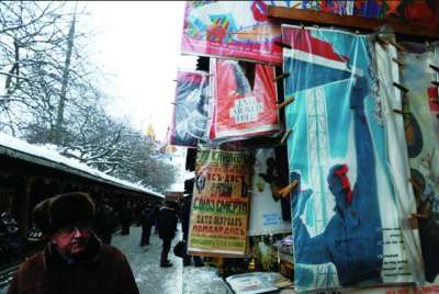 我想带点最有俄罗斯风情的特产,一时拿不定主意,不知道是选择苏联时期绘有工人和宇航员形象的宣传海报,还是挑些做工精美的仿古银器。妻子倒是很有主意,一定要给岳母的餐桌添一块刺绣台布。我俩不畏严寒,再也顾不得脚下覆满冰雪的地面多么难走,从一个柜台辗转到另一个柜台,大有一副不杀价到手软就不回美国的架势。