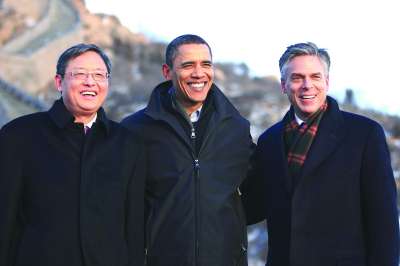 奥巴马(中)洪博培(右)在北京八达岭长城(资料照片)