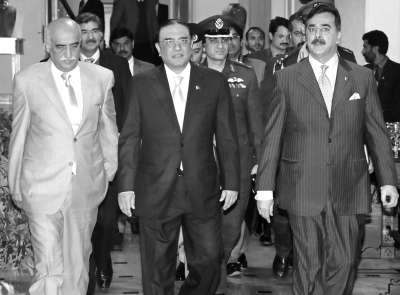 16日,吉拉尼(右)与扎尔达里(中)讨论最高法院对总理提出的藐视法庭控告。
