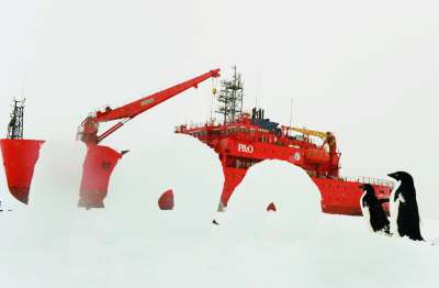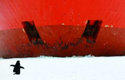 1月13日,一只阿德利企鹅从“南极光”旁边走过。 |