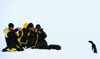 1月13日,破冰船成员举起相机为好奇的阿德利企鹅拍照。 |