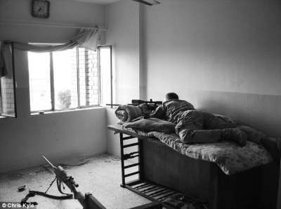 30岁的海豹突击队第三小队队员、狙击手克里斯·凯尔隐蔽在一栋伤痕累累的楼房的第4层,趴在一张婴儿床上,手持狙击步枪,观察着楼下的动静。