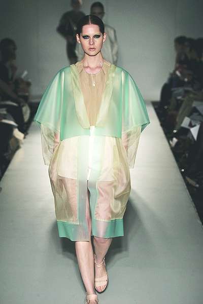 近两年流行的塑料装被大牌设计师多次演绎,备受追捧的设计师克里斯托弗·凯恩设计的塑料装讲求的是未来主义,闪亮的设计在任何时候都是高调的表现。而英国皇家艺术学院毕业生Itziar Vaquer与凯恩这位毕业于圣马丁的前辈不同的是,他将塑料装做成哑光的质感,在低调、清爽的配色中展示出温和大气的效果。
