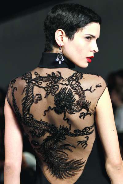 要调和龙形象与时尚单品之间的矛盾,必须要在设计上采用一些迂回手法。大牌设计师大多喜欢采用东西合璧的方式,来自美国的时尚品牌拉夫·劳伦在龙年推出不少以“龙”为主题的成衣,拉夫·劳伦在演绎龙元素时主要采用两种方式:一是以黑色中和龙图纹的抢眼,使龙像纹身一样出现在模特的背上,令龙的霸气得到收敛;二是呈现龙的部分形状,仅将其局部姿态呈现在大衣、外套、马夹上,既表现了浓郁的中国味道,也不会过于偏离时尚圈的潮流。
