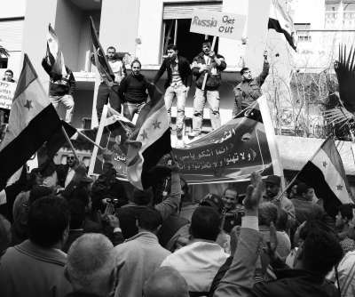 2月5日,利比亚的黎波里,叙利亚政府反对者在俄罗斯驻黎巴嫩使馆外进行抗议活动。
