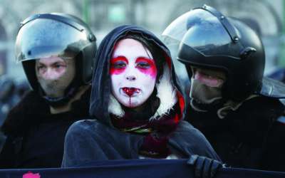 圣彼得堡的示威者身穿吸血鬼服饰。他们要求公平选举,抗议普京参加总统大选。 |