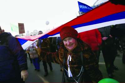 莫斯科“沼泽”广场上,老妇帮助撑起俄罗斯国旗。 |