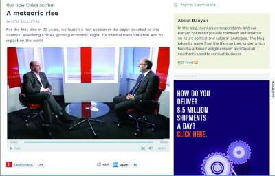 如今,在《经济学家》的网站上,“中国”已成为一个与“亚洲”、“欧洲”、“美国”等并列的栏目。在今年1月28日已经出刊的新一期《经济学家》杂志上,关注的题材既包括中国的空气污染、死刑存废等热门话题,也包括云南的种植业。