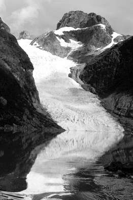 即便到了巴塔哥尼亚,不看上一眼冰河也算白来。这也是我多年来的夙愿,心里对于第3天的行程自然充满期待。当得知蔓延的野火封锁了陆地交通线,那种失望之情真的令我难过。幸好导游反应迅速,提醒我还可以经水路前往。登船后,我们首先驶入“最后希望”湾,大概是因为与前一天居高临下的视角有别,我居然发觉峭壁上的岩石组成了各种象形图案,窄小的冰瀑夹杂其间,远方的苍白色斑点勾勒出冰原的边沿。紧接着,渡船拐了个弯,直冲一条冰河扎去,两岸都是漆黑的峭壁,那飞扑而下的势头真不缺威压感。