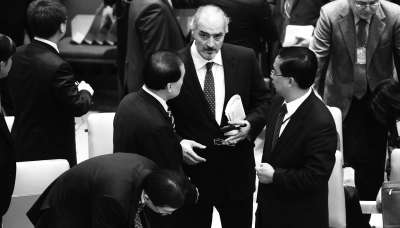 (图)2月5日,安理会投票前,叙利亚驻联合国代表巴沙尔(中)与中国驻联合国代表李保东(左)交谈。