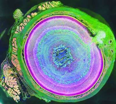 在报名摄影单元的所有作品里,拔得头筹的是一张鼠眼横截面。研究者给老鼠眼睛染上了色彩,以观察鼠眼组织内的新陈代谢痕迹如何错综复杂。