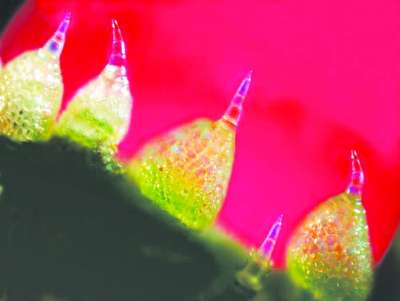这根被放大800倍的黄瓜还未成熟,其表皮上的芒刺被称为毛状体。它们的顶端比缝衣针还要细40倍,是黄瓜为了从食草动物嘴里自保而进化出的。