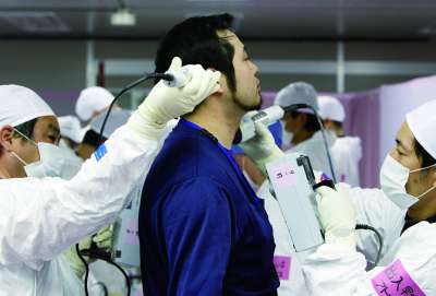 记者在东京电力公司员工的指引下进入福岛第一核电站。 |