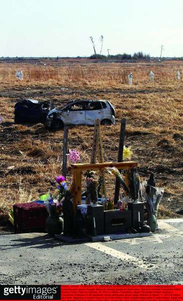 浪江町废墟前摆放的供品,寄托了生者的哀思。 |