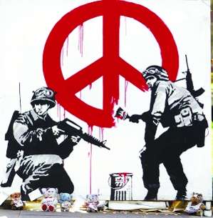 班克斯1974年出生于英国布里斯托尔,从未受过正规艺术训练。其作品多以反战为题材,极尽嘲讽之能事,画板也不拘一格,可以是街道角落的墙壁,也可以是汽车车身、公园的长凳,甚至是动物的身体。班克斯目前是英国最抢手的地下画家,被誉为当今世界上最有才气的街头艺术家之一。