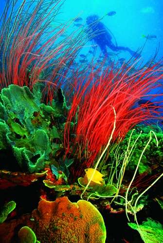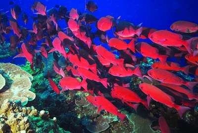 成群的黄背梅鲷纷纷前来围观不速之客,头顶上是尾巴呈风筝状的金环刺尾鱼,脚下横卧着外壳犹如虎皮的巨蛤,还有一串串音符似的蠕虫……最搞笑的要数可爱的小丑鱼,尼莫(美国动画电影《海底总动员》中的角色)的兄弟姐妹们摆动身躯,勇敢地捍卫着自己挚爱的粉色海葵。啊,真是个动人的新世界!我心里暗自纳罕:在丛林深处,再漂亮的鸟儿也会从眼前倏忽飞过;当你身处海底,却能体会到另一种能亲手抓住的美丽。