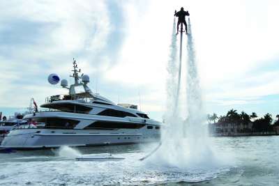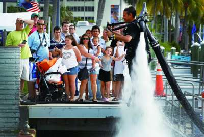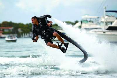 2月17日,肖恩·菲利普斯在美国迈阿密海滩的游艇经纪展会上,展示了一款JetLev-Flyer水动力飞行背包。从外观上看,JetLev-Flyer和电影里的飞行器并无太大差别,不过它采用的是强大的车用发动机和喷水系统,能维持在空中的平衡,将佩戴者送上距水面约15米的高度。使用时,背部抽水管需要连接小艇上的抽水泵来传导水源。 图片来源CFP