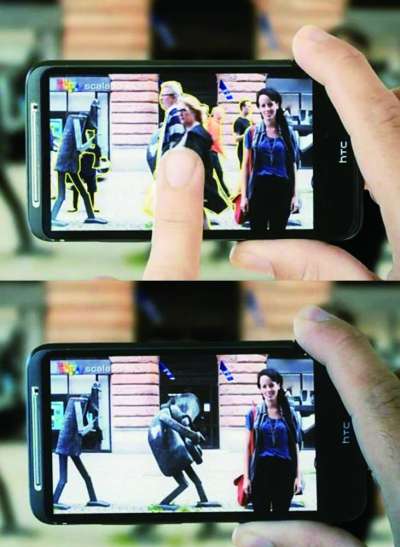 采用了这款应用的手机在按下快门时会连续拍摄多幅相片,并自动叠加在一起。同时,应用程序会对相片进行分析,检测出其中的人像和景物,并用高亮的线条勾画出来。拍照者只需轻触屏幕,就可以把背景中碍眼的人物或景物移除了。