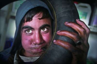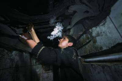 ②11岁的阿尼斯边修车边吸烟。